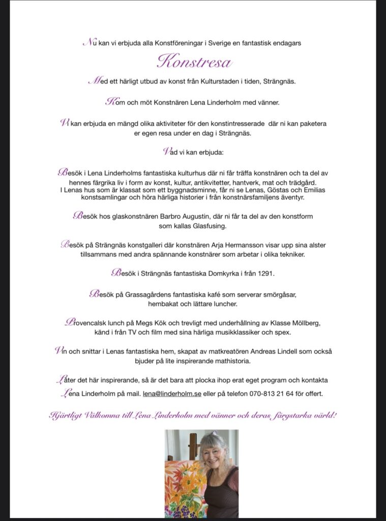 Välkommen till en skräddarsydd kulturupplevelse. Är ni en konstförening, företag, ledningsgrupp, kompisgäng som vill njuta av en härlig dag med kultur, konst musik och god mat så skall ni kontakta mig för mer info och förslag på program. Färgglada hälsningar från Lena 🍒